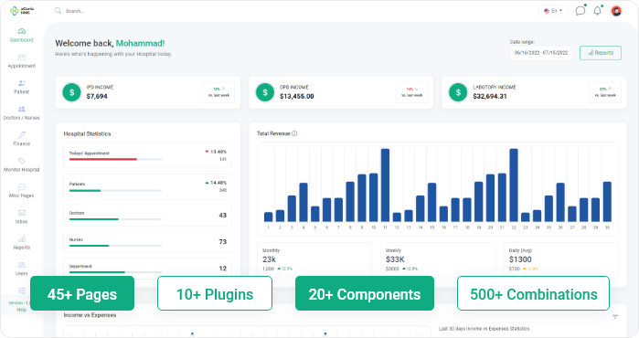 aConic HMS admin is a responsive Bootstrap admin dashboard template built for everyone who wants to create web apps on top of the most popular framework, Bootstrap. Whether you are creating an Hospital Management System web application, dashboard, admin panels, or SASS based interface — aConic HMS admin feature-rich components and designed demo pages help you create the best possible Hospital Management System web application projects. aConic HMS admin helps your team moving faster and saving development costs.