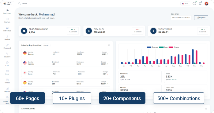 aConic LMS admin features over 60+ individual pages featuring various components, giving you the freedom of choosing & combining. All components can take variation in styling, that can easily be modified using Sass. The sky is the limit!