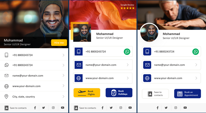 Forget about old fashioned printed visiting cards that generally goes to the dustbin. With our Digital Business Card, you can customize and share your contact information that has Actionable one clicks events like Call, Email, WhatsApp, Navigation, Website Link, Payment, Social Links, Maps, and more.